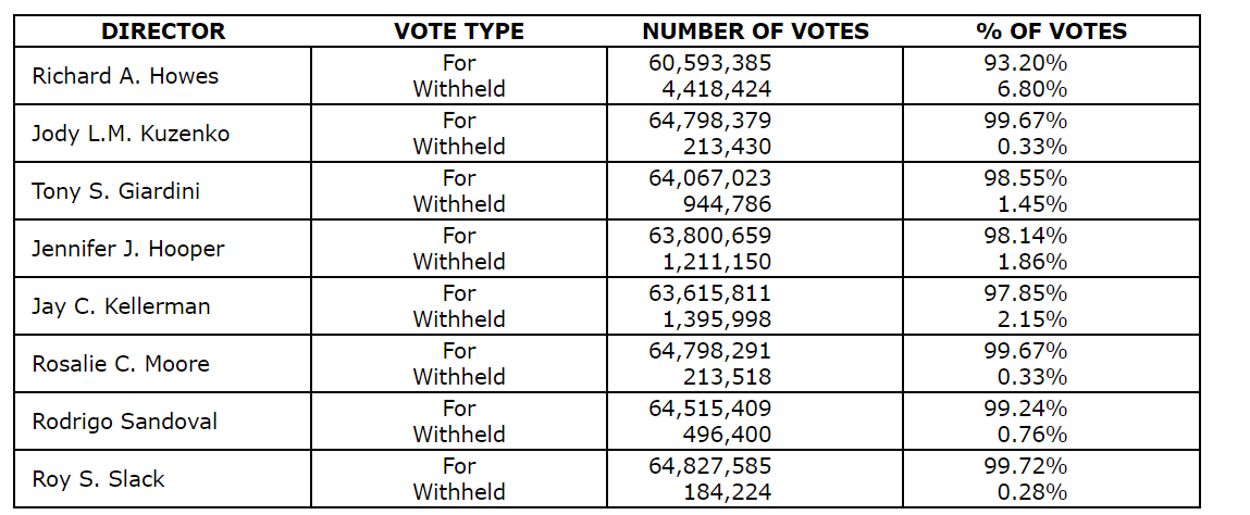 At the meeting, all director nominees listed in the company's management information circular dated May 10, 2023, were elected as directors of the company. Detailed results of the vote by ballot are provided in an attached table.
