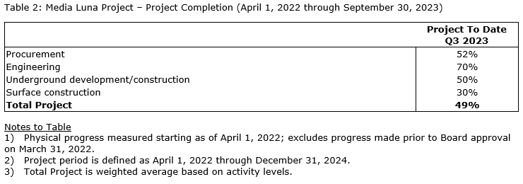 Based on progress made during Q3 2023 and a detailed review of both the surface and underground schedules completed late in the quarter, the overall project end dates are unchanged compared with the prior plan outlined within the inaugural Media Luna update press release published on Feb. 9, 2023, with some movement within the plan as set out below.