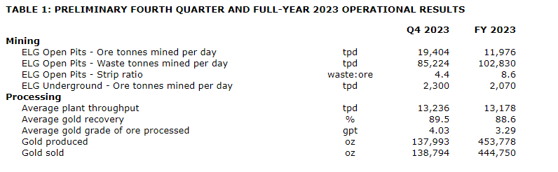 "A number of operational records were broken this year. The operational momentum in ELG underground continued with an average mining rate of 2,300 tonnes per day (tpd) during the quarter, and an average rate of 2,070 tpd for the year, surpassing the previous annual record set in 2022. In the ELG open pits, average ore production of 19,404 tpd set a new record for daily ore tonnes mined in a quarter and, as anticipated, gold grades improved in the quarter with the period of heavy waste stripping concluded. Throughput rates in the processing plant remained above 13,000 tpd for the fourth consecutive quarter as plant uptime averaged 92.7 per cent during Q4. The consistent performance in the processing plant culminated in a new annual throughput record of 13,178 tpd.