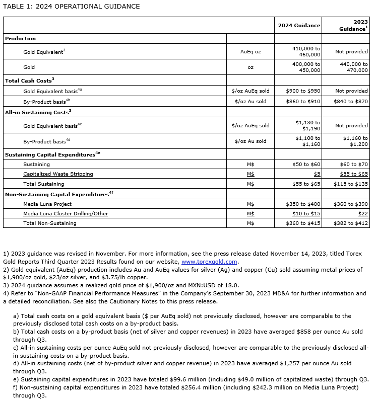 TOREX GOLD PROVIDES 2024 OPERATIONAL GUIDANCE AND UPDATED FIVE-YEAR PRODUCTION OUTLOOK