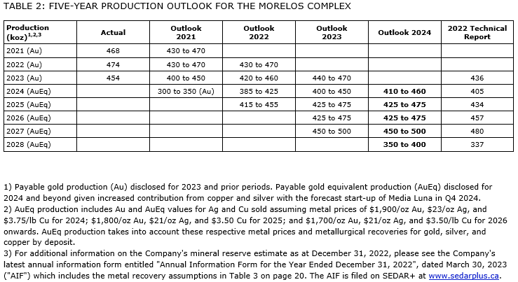 "In addition to releasing 2024 guidance, we have updated and extended our five-year production outlook to 2028. Gold equivalent production through 2027 remains consistent with the previous five-year outlook with average annual production of over 450,000 ounces. For 2028, gold equivalent production is forecast at 350,000 to 400,000 ounces, which is materially higher than the 337,000 ounces estimated in the 2022 technical report, reflecting the benefit of reserve additions over the last two years. Work to strengthen the longer-term production outlook for Morelos in 2028 and beyond is ongoing -- in 2024, this will include completing an internal prefeasibility study on EPO and continuing to aggressively drill off ELG underground.