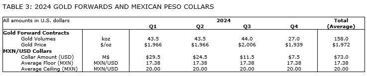 As reported in Q3 2023, the company has also entered into a series of foreign exchange zero-cost collars whereby it sold call option contracts and purchased put option contracts for nil cash premium to hedge against changes in foreign exchange rates of the Mexican peso. This was to protect the exposure of peso-denominated expenditures for the Media Luna project. At this time, there have been no changes to the hedges put in place compared with what was previously reported.