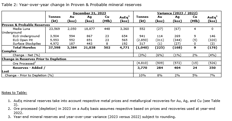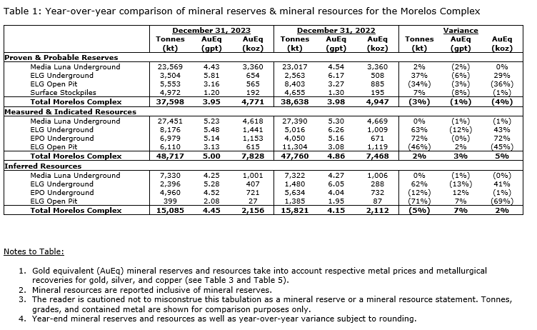 "Our strategy to grow reserves and resources has been supported with meaningful investment, with an average of $31-million invested annually for each of the last three years, reflecting the strategic pivot towards drilling made in 2020. Since releasing the March, 2022, technical report, we have increased our measured and indicated resource (1) base by 1,979,000 oz AuEq (prior to mined depletion) over the last two years and strengthened the production profile by increasing our proven and probable reserves by 719,000 oz AuEq (prior to processed depletion) over the same period. The ongoing success demonstrates the significant mineral endowment at Morelos and the potential to generate significant shareholder value from Morelos far into the future."