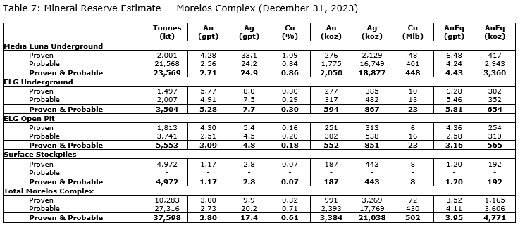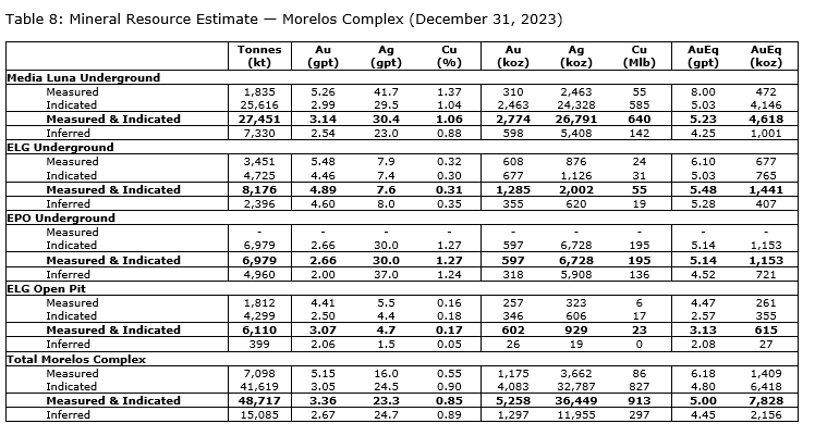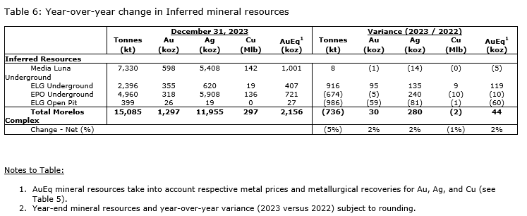 Measured and indicated resources specific to Media Luna declined 51,000 oz AuEq, reflecting refined geological interpretation related to dikes encountered during underground development.
