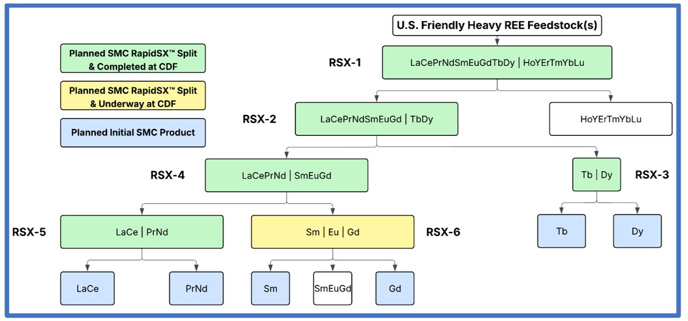 The CDF work has focused on the precise manipulation of tonnes of a heavy mixed rare-earth oxide derived from a US-friendly feedstock resource through the series of RapidSX™ splits shown in Figure 1.