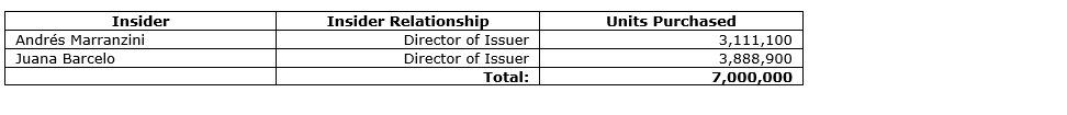 Insiders of the company subscribed for units under the offering, as detailed in the attached table.