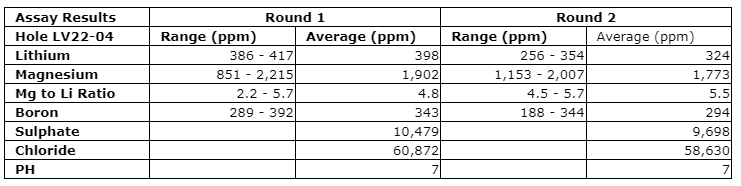 In January 2023 Drill hole LV22-04 at location S 25degree 18' 51,3"; W 67degree 57' 55,7" was drilled down to 227 meters and assayed up to 417 parts per million ("ppm" or "mg/L") lithium (Li) from two rounds of sampling completed in January - February 2023 (see press release dated February 28, 2023). Earlier, the geophysical study of well LV22-01 at location S 25degree, 19', 12.40"; W 67degree, 56', 58.05 indicated the presence of a continuous single brine aquifer comprising of mainly clastic sediments from 14 meters to 205 meters depth with a marked hydrothermal presence towards the deeper section. Conductivity shows an increase with depth, which is interpreted to achieve better lithium concentrations through pumping and more cleaning of the well. Overall concentration of ions and metals indicate a single unconfined aquifer down the sampling depth of 120 m.