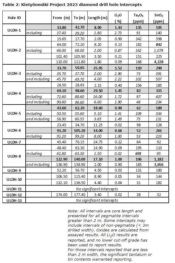 The 2022/2023 drilling program at Kietyonmaki comprised 13 diamond drill holes for a total of 1,449.40 metres and the collection of 100 percussion drill hole samples completed between September, 2022, and February, 2023. The diamond drilling aimed to complete both infill and expansion drilling on the Main dike whereas the percussion drilling targeted discovery outside the Main dike. The drill program was successful in expanding the drill-confirmed length of the Main dike from 60 metres to approximately 205 metres and in confirming the depth of the body to at least 160-metre depth below surface. Percussion drilling results highlight possible new pegmatites that warrant follow-up drilling in 2024, with two occurrences located 100 metres and 230 metres southeast of the Main dike. The Main dike is spodumene and petalite bearing, with some notable tin and tantalum mineralization, with SnO2