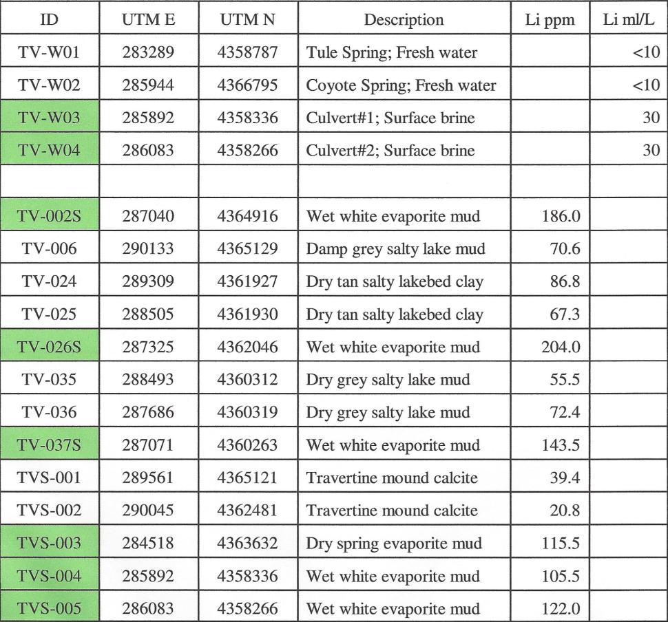 A total of 4 water samples and 13 soil samples were collected from the property. The soils were crushed, pulverized and assayed for lithium and a suite of pathfinder elements (eg, K, Mg, B, F, Na, Ca, Li/K and Li/Mg ratios). Most soil samples were collected at the claim post sites that were located on exposed playa.