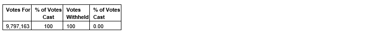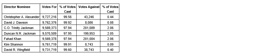 By a vote conducted by poll, the seven nominees set forth in the circular were elected as directors of the company. The specific voting results are provided in an attached table.