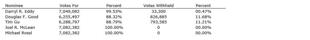 Five existing directors were re-elected as directors of the company for the ensuing year by the votes detailed in the attached table, out of a total of 7,153,982 shares voted, representing 37.63 per cent of total shares outstanding.