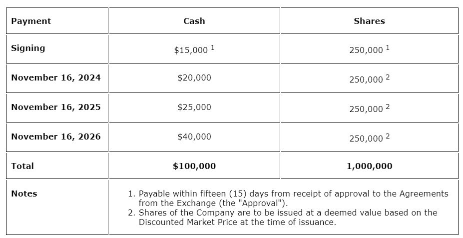 Pursuant to the option agreement, the company may acquire a 100-per-cent interest in the property by paying the vendors a total of $100,000 and issuing an aggregate of 600,000 common shares in the capital of the company as indicated in the associated table.