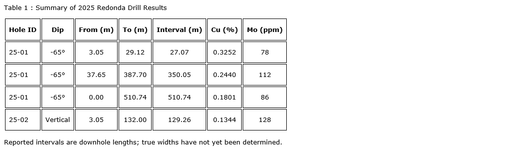 The results indicate that copper-molybdenum mineralization at the Redonda project is laterally and vertically continuous within the drilled area. A valid drill permit is in place, permitting continued drilling at the project during the 2026 exploration season.