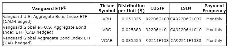 Vanguard Investments Canada Inc. has released the final January, 2024, cash distributions for certain Vanguard ETFs (exchange-traded funds), listed in the attached table, that trade on Cboe Canada. Unitholders of record on Feb. 2, 2024, will receive cash distributions payable on Feb. 9, 2024. Details of the per-unit distribution amounts are as shown in the attached table.