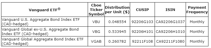 Vanguard Investments Canada Inc. has declared the final December 2023 cash distributions for certain Vanguard ETFs (exchange-traded funds), listed herein, that trade on Cboe Canada. Unitholders of record on Dec. 27, 2023, will receive cash distributions payable on Jan. 4, 2024. Please be advised that the distributions announced in this press release replace those stated in the Dec. 18, 2023, press release for these funds.