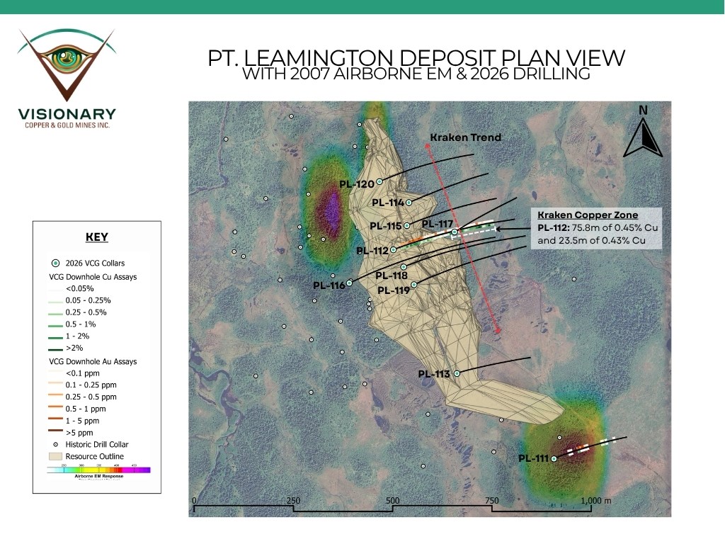Max Porterfield, President and CEO of Visionary Copper and Gold Mines Inc., stated "What began as a 3,000-meter program to test key target areas nearby the existing Pt. Leamington mineral resource quickly evolved with the exciting discovery of the Kraken copper zone. The decision to expand the campaign reflects my commitment to aggressively advance the Pt. Leamington deposit. Assay results from the seven holes drilled to test Kraken are eagerly awaited, and I believe the results will further demonstrate the copper endowment at Pt. Leamington."