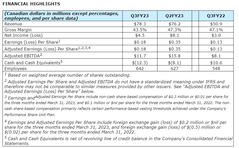 Achieved a new quarterly revenue record with third quarter sales climbing 54 per cent to $78.3-million, from $50.9-million in Q3 fiscal 2022.