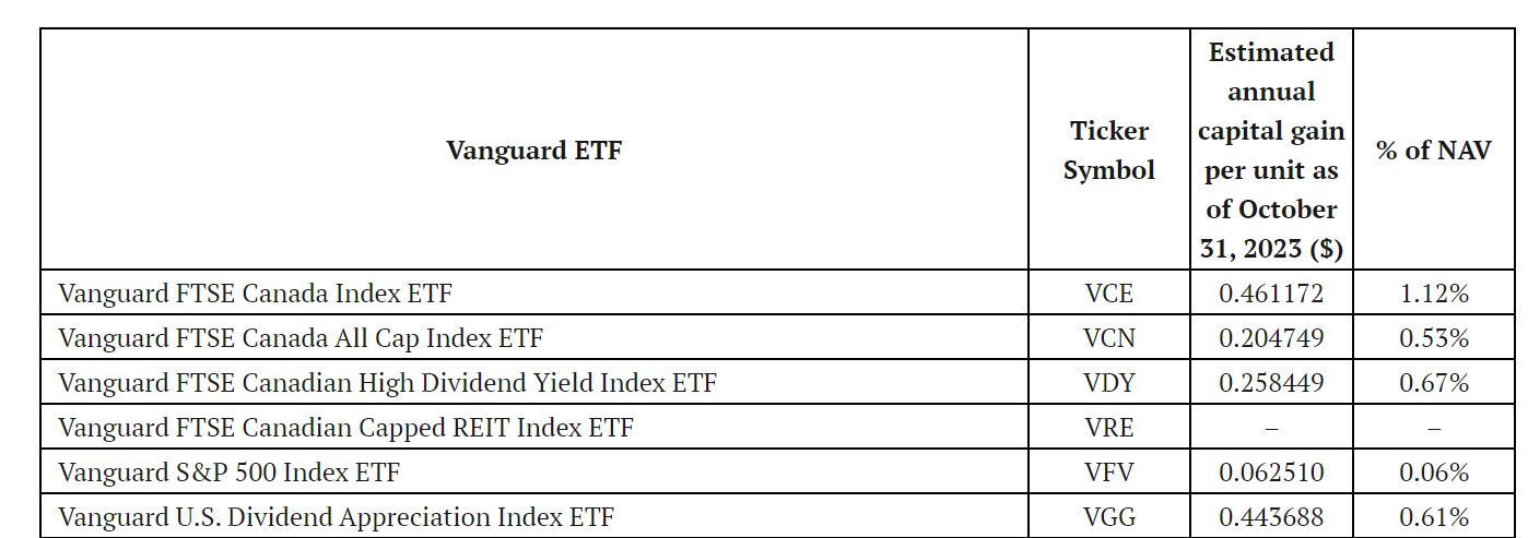 VANGUARD INVESTMENTS CANADA ANNOUNCES ESTIMATED 2023 ANNUAL CAPITAL GAINS DISTRIBUTIONS FOR THE VANGUARD ETFS