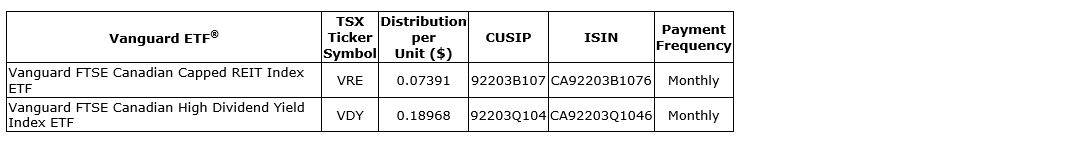 Vanguard Investments Canada Inc. today declared the final April, 2026, cash distributions for certain Vanguard ETFs (exchange-traded funds), listed in the attached table, which trade on the Toronto Stock Exchange. Unitholders of record on April 17, 2026, will receive cash distributions payable on April 24, 2026.