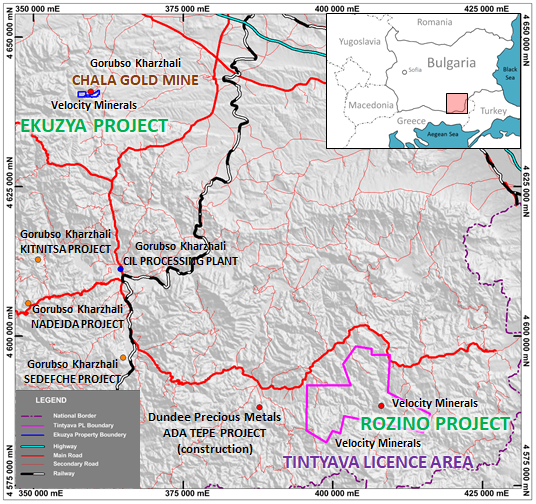 Figure 2: Location of the Rozino Project relative to Tintyava licence area, Ekuzya Project, Gorubso's CIL processing plant, and the Ada Tepe development project.