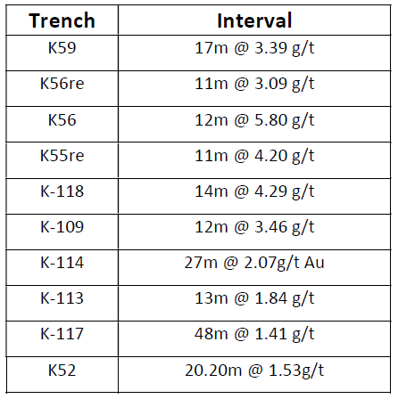 at present difficult to ascertain. Trench locations are shown on Figure 1 together with the locations of trench intervals greater than 0.6g/t gold.