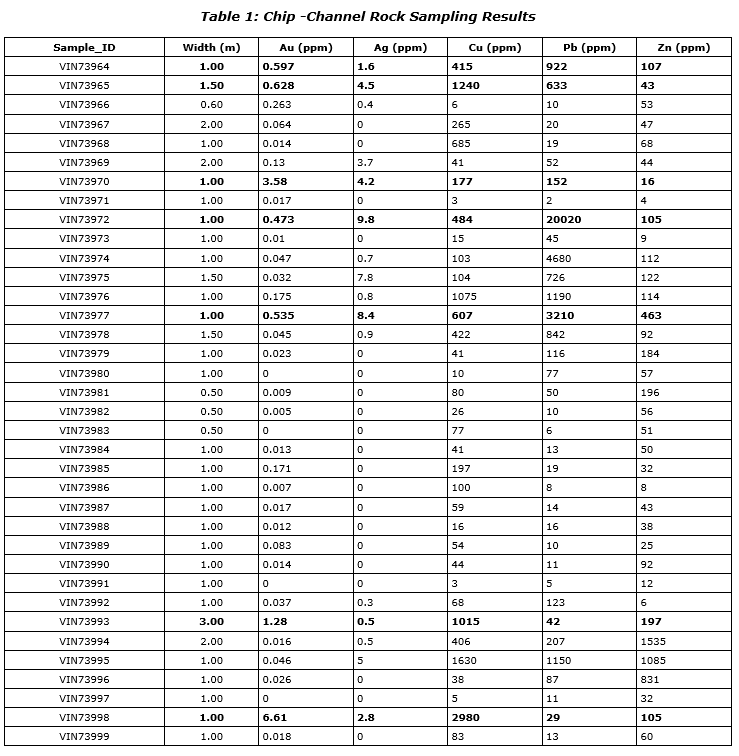 Historically reported copper-gold mineralization has been observed in outcrop by the company's technical team during its reconnaissance work. Chip-channel rock sampling by the company (n equals 36) over widths of one metre to three metres returned encouraging grades from below detection to up to 6.61 grams per tonne gold, 0.3 per cent copper and 4.2 g/t silver (see the table below).