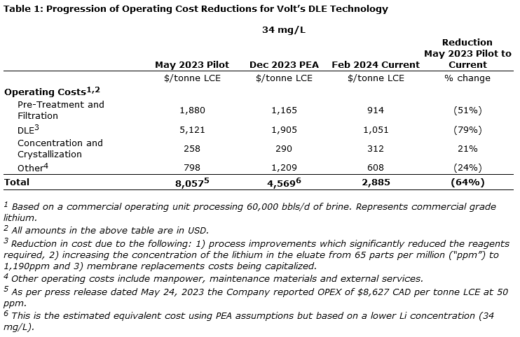 Volt continues to accelerate process improvements related to its proprietary DLE technology at the company's demonstration plant. The associated operating cost reductions are highlighted in the table below, showing continuous improvement over three key periods in Volt's ongoing advancement of its DLE technology, including: 1) May 2023 pilot operations; 2) December 2023 demonstration plant operations for the Preliminary Economic Assessment ("PEA"); and 3) Year to Date 2024 process improvements achieved at the demonstration plant by the company's scientific and engineering teams. Brine used in each of the periods was sourced from the 15-1-111-06W6M well (the "Feedstock Well") producing from the Keg River formation at Rainbow Lake, and had an initial lithium concentration of 34 mg/L.