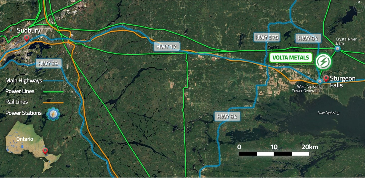 The Springer Deposit is approximately 70 km east of the nearby city of Sudbury, and 15km north of Sturgeon Falls, Ontario (Figure 4). The Deposit location provides excellent access to infrastructure, as the site is accessible via Highway 64, which connects Sturgeon Falls and Field, Ontario. Proximity to highways, the Crystal Falls and Sturgeon Falls hydroelectric dams, hydroelectric power lines, a natural gas pipeline, and the Canadian National Railway line runs through the region, offering direct transportation connectivity.