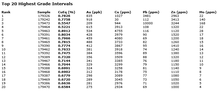 - Maximum CuEq: 0.7826 per cent (7,826 ppm) -- sample 179326;