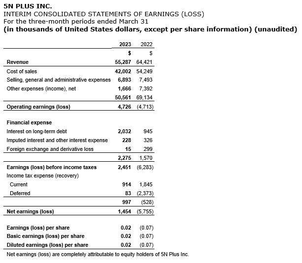 5N PLUS REPORTS 2023 FIRST QUARTER FINANCIAL RESULTS