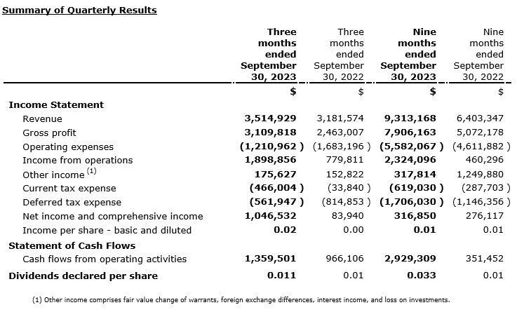 Kyle Floyd, chief executive officer, stated: "Our third quarter reflects record quarterly and year-to-date gross profits, underpinned by strong revenue that is in line with the annual revenue guidance we announced on April 27, 2023. Our differentiated, returns-focused strategy continues to generate significant fundamental value for investors. To complement the organic growth of our portfolio, we have strategically acquired 10 royalties in Australia over the past two months. We expect these to unlock medium- to long-term revenue from key gold and copper assets such as Red Hill, Plutonic East and Horseshoe Lights. In addition to these recent asset acquisitions, we were pleased to announce an innovative coal [intellectual property] licensing transaction aimed at unlocking latent value for Vox shareholders."