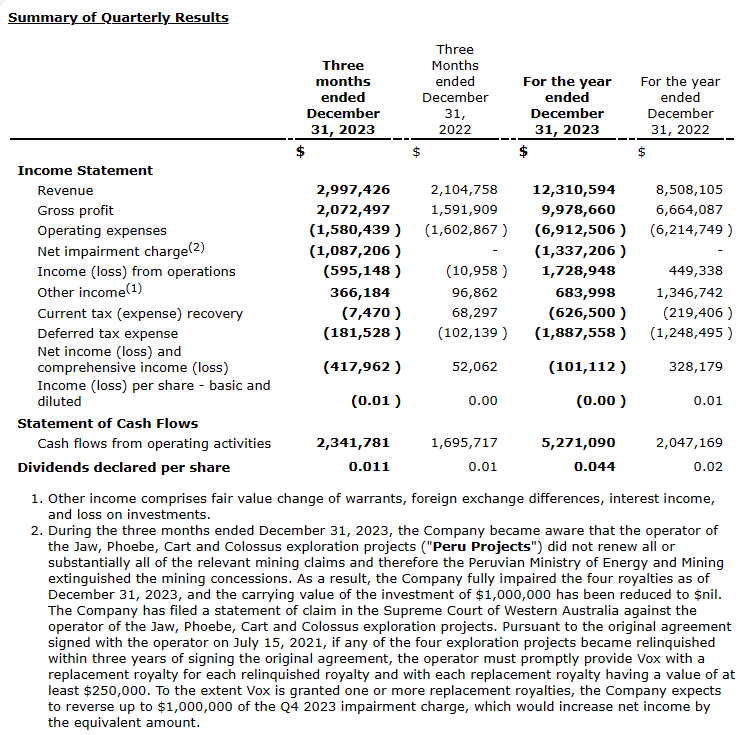 For complete details, please refer to the consolidated financial statements and associated Management Discussion and Analysis for the years ended December 31, 2023, available on SEDAR+, EDGAR or on Vox's website.
