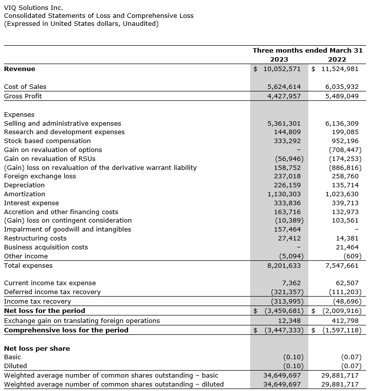 VIQ SOLUTIONS REPORTS FIRST QUARTER 2023 FINANCIAL RESULTS