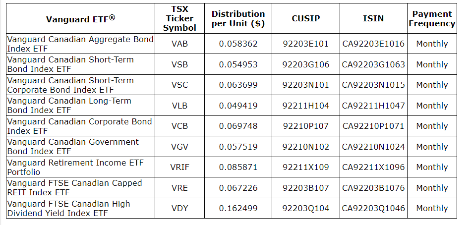 Vanguard Investments Canada Inc. has declared the final November, 2023, cash distributions for certain Vanguard exchange-traded funds, listed below, that trade on Toronto Stock Exchange (TSX). Unitholders of record on Dec. 1, 2023, will receive cash distributions payable on Dec. 8, 2023. Details of the per-unit distribution amounts are as noted herein.