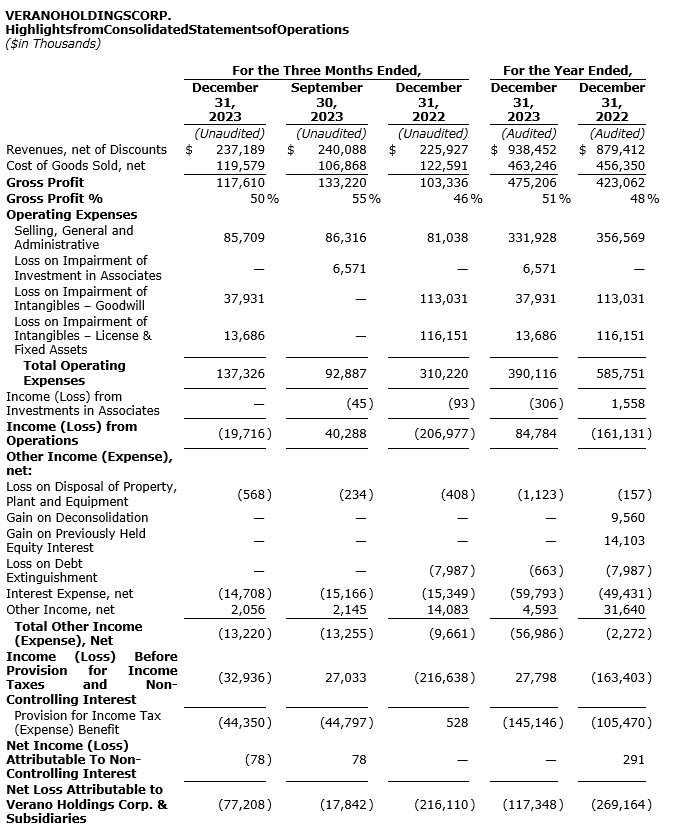 Verano Holdings Corp. has released revised financial results for the fourth quarter and full year ended Dec. 31, 2023, which were prepared in accordance with U.S. generally accepted accounting principles (U.S. GAAP). (All dollar amounts are in U.S. dollars, except as otherwise noted.)