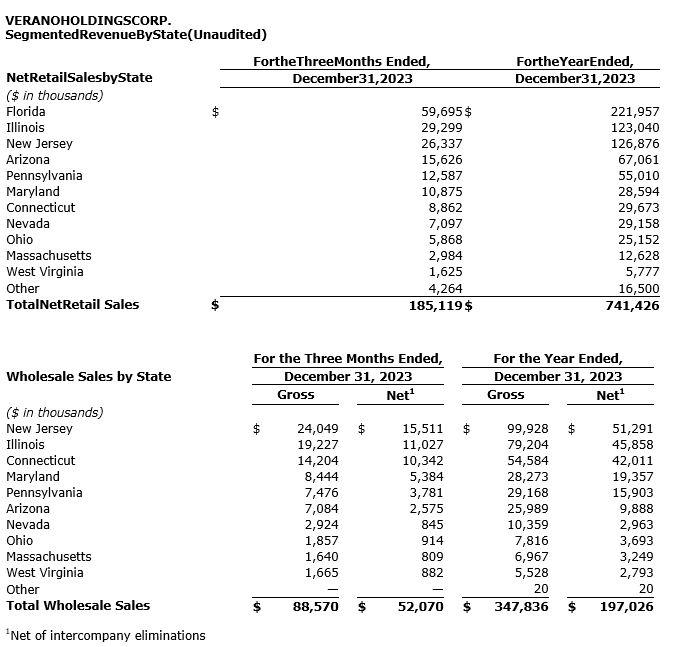 "I'm incredibly proud of our performance in 2023, highlighted by key wins across all aspects of the business," said George Archos, Verano founder and chief executive officer. "As excitement and anticipation builds in the industry, 2024 has the potential to be a game-changing year, and Verano is well positioned to continue capitalizing on growth opportunities both in the current regulatory environment and from any state or federal reform. While we've never been dependent on legislation to drive sustained growth, with adult use imminent in Ohio, on the horizon in Florida and Pennsylvania, and the growing anticipation of a federal rescheduling decision, there is limitless potential for Verano. I'm thankful for all that our team accomplished in 2023, and believe the sky is the limit for what we can achieve in 2024 and beyond."