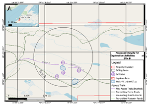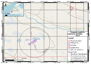 The commodity of interest on the property is halite (salt). A total of two (2) drill sites are proposed with a max 2,500 meters drilled in 2023. Of the meters drilled, a maximum of 1,100 meters will be evaluated using downhole geophysical instrumentation. The Company will utilize pre-existing gravel trails within the property boundary with <4 meters clearings for vehicles. These trails need little to no preparation to improve trail conditions. An additional <2 kilometers of new access trails will need to be brushed; “brushing” will consist of clearing the trail of material for a skid-mounted rig to travel through and will not involve any line cutting. The pre-existing trails that will be utilized, and the new proposed new access trails necessary to operate can be found on Figure 1 and Figure 2.