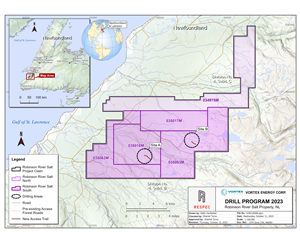 VANCOUVER, British Columbia, Oct. 16, 2023 (GLOBE NEWSWIRE) -- Vortex Energy Corp. (CSE: VRTX | OTC: VTECF | FRA: AA3) (“Vortex” or the “Company”) is pleased to announce that the Company has received approval from the Mineral Lands Division, Department of Industry, Energy & Technology, Newfoundland and Labrador, of its Application for Exploration Approval for the 23,500 hectare Robinsons River Salt Project (the “Property”). The permit application was submitted on August 24th, 2023 by RESPEC Consulting Inc. (“RESPEC”) who has been commissioned to conduct the proposed work on behalf of Vortex.