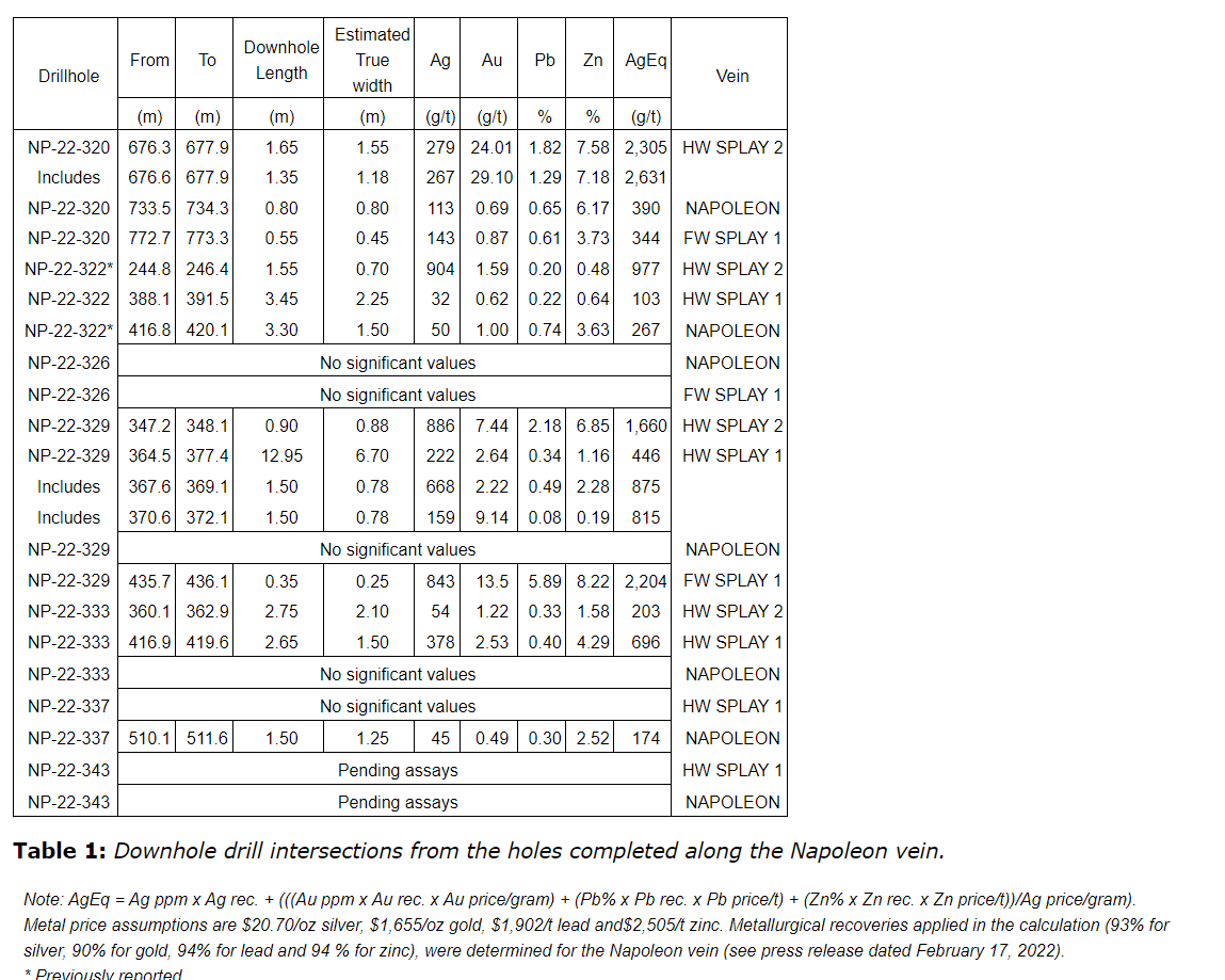 NP-22-320 returned 2,305 grams per tonne silver equivalent over 1.55 metres true width (mTW) (279 g/t silver, 24.01 g/t gold, 1.82 per cent lead and 7.58 per cent zinc), including: