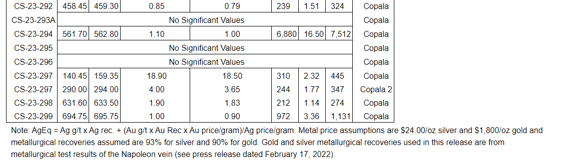 CS-23-290 returned 760 g/t AgEq over 5.05 mTW (565 g/t silver and 3.48 g/t gold):