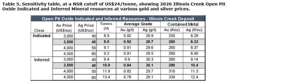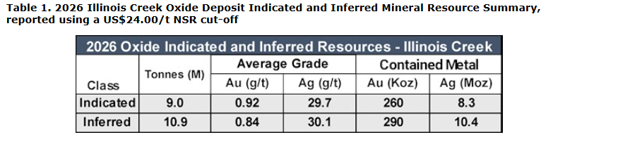 - The updated mineral resource estimate uses the 2021 block model as reported in "NI 43-101 Technical Report, Illinois Creek Project, Western Alaska" issued on July 21, 2021.