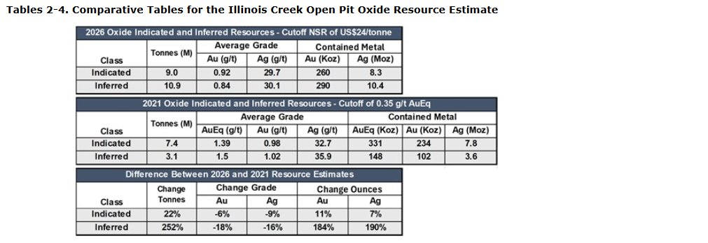 Tables 2 and 3 present the 2026 and 2021 resource estimates, respectively, while Table 4 summarizes the changes between the two estimates. No additional drilling was completed between the 2021 and 2026 estimates. Table 5 illustrates how the 2026 restated resource estimate varies under different gold and silver price assumptions.