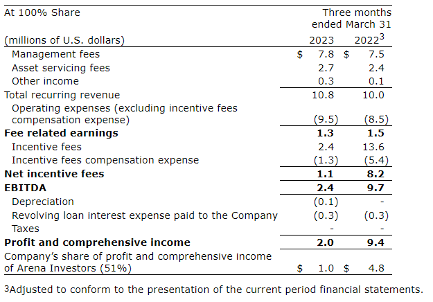 Net incentive fees of $1.1-million in Q1 2023 were lower than the $8.2-million in Q1 2022 reflecting lower positive fund performance.