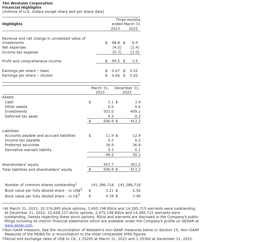 THE WESTAIM CORPORATION REPORTS Q1 2023 RESULTS