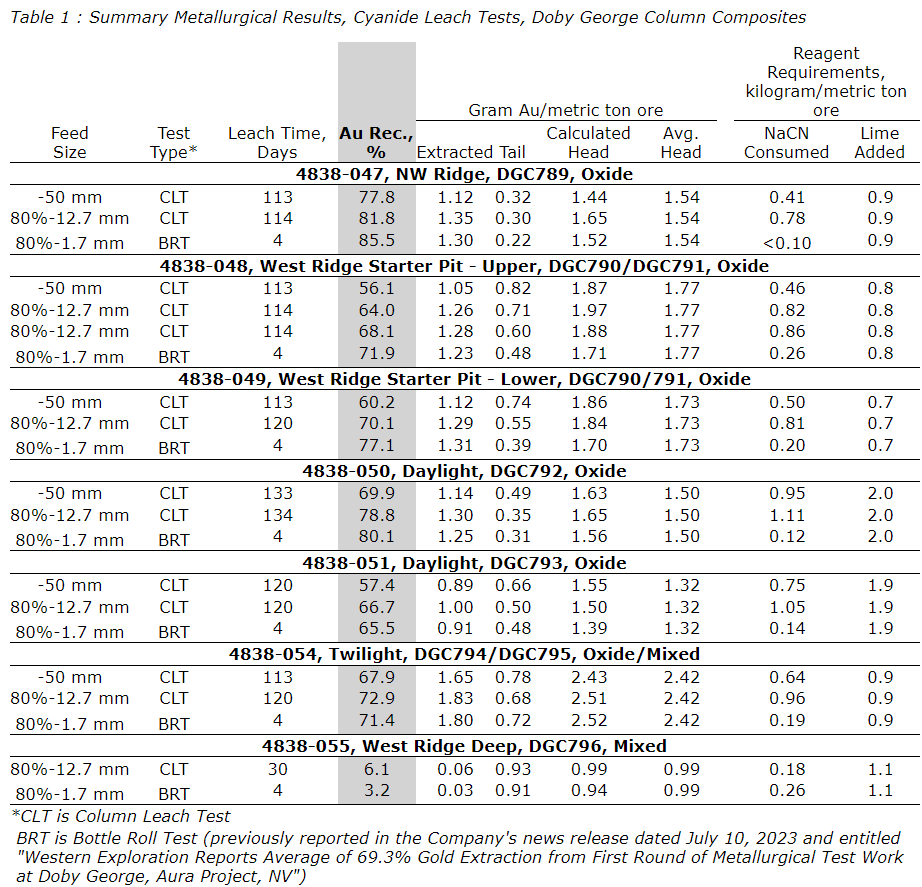 A detailed heap-leach testing program was conducted on drill composites representing gold-bearing oxide and mixed materials collected from the Doby George deposit with PQ drilling in 2022. Agitated cyanidation bottle roll tests were conducted on a total of 46 drill core composites to obtain preliminary information regarding heap-leach amenability and ore variability. The results of the bottle roll tests were reported in the company's news release dated July 10, 2023. Based on the results of the bottle roll testing, a total of seven master (column test) composites were prepared for column leach testing. Five oxide and one blended oxide/mixed column leach tests were conducted at minus-50 mm (two-inch) and 80 per cent minus-12.7 mm (1/2-inch) feed sizes. A seventh composite, representing mixed material from deep within the West Ridge area, was tested at an 80 per cent minus-12.7 mm feed size. The column tests were conducted to determine gold recovery, recovery rate, reagent consumptions and feed size sensitivity under simulated heap leaching conditions. Summary results are presented in the table entitled "Summary metallurgical results, cyanide leach tests, Doby George column composites."