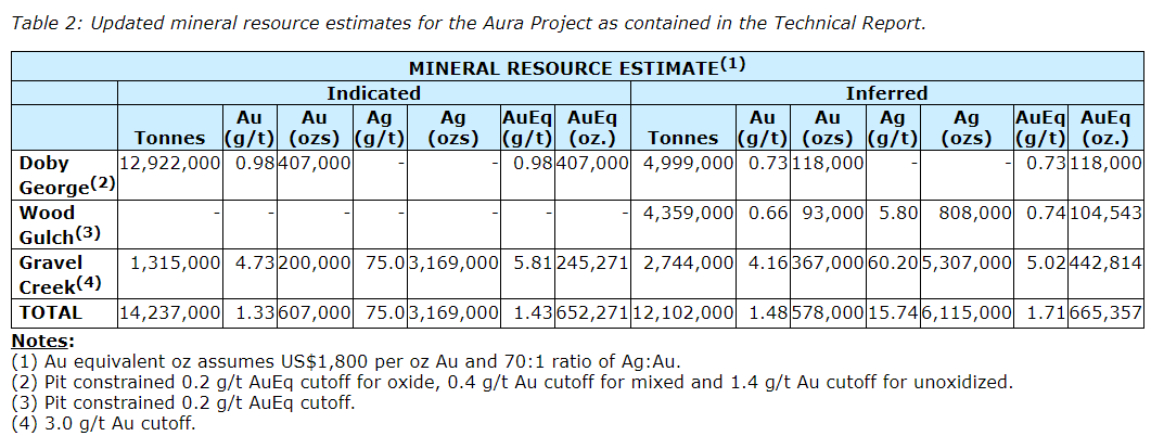 The 6,000-hectare Aura project has identified mineral resources in three different deposits (Doby George, Gravel Creek and Wood Gulch), as supported by technical report (see the table entitled "Updated mineral resource estimates for the Aura project as contained in the technical report").