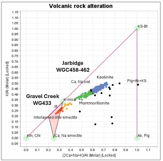 - Gravel creek (hosted in the Eocene Frost Creek tuff): Alteration in core hole WG443 was dominated by an illite assemblage, indicating the depositing fluids were near neutral pH conditions.