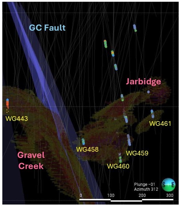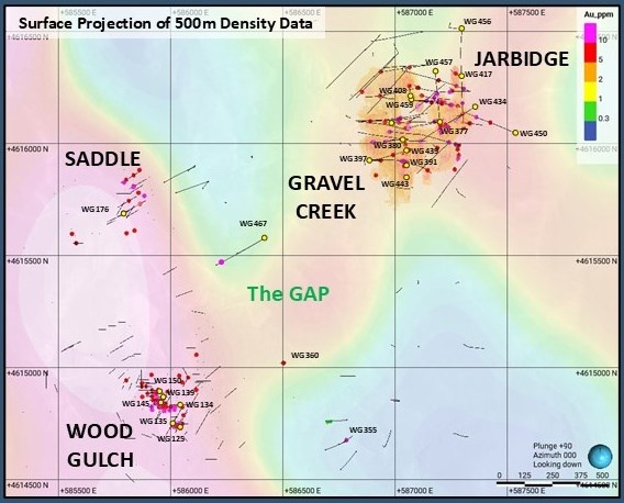 Figure 3. Plan map showing high grade intercepts from Wood Gulch to Gravel Creek