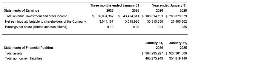 The attached unaudited financial information, including comparative information, is expressed in Canadian dollars and has been prepared in accordance with international financial reporting standards, using the same accounting policies and methods of application as described in notes 3 and 4 of the company's audited consolidated financial statements for the years ended Jan. 31, 2026, and Jan. 31, 2025.