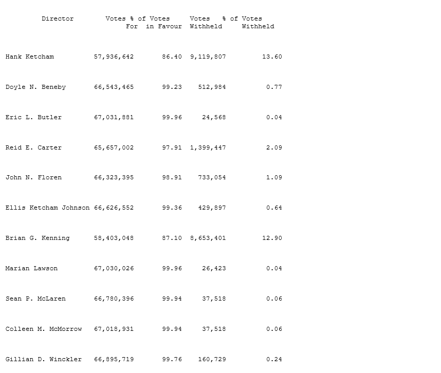 A total of 69,106,612 common shares and Class B common shares were voted at the meeting, representing 88.26 per cent of the votes attached to all outstanding shares. Shareholders voted in favour of all items of business before the meeting, including the election of all director nominees, as detailed in the attached table.